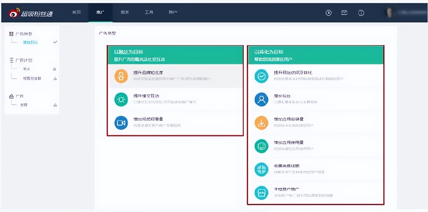 选择微博粉丝通做广告投放的选择是正确的,但是在做微博粉丝通广告时,我们需要选择好广告推广产品,为了让微博粉丝通广告有好的效果,那么我们一定好搭建好微博粉丝通的广告账户!
